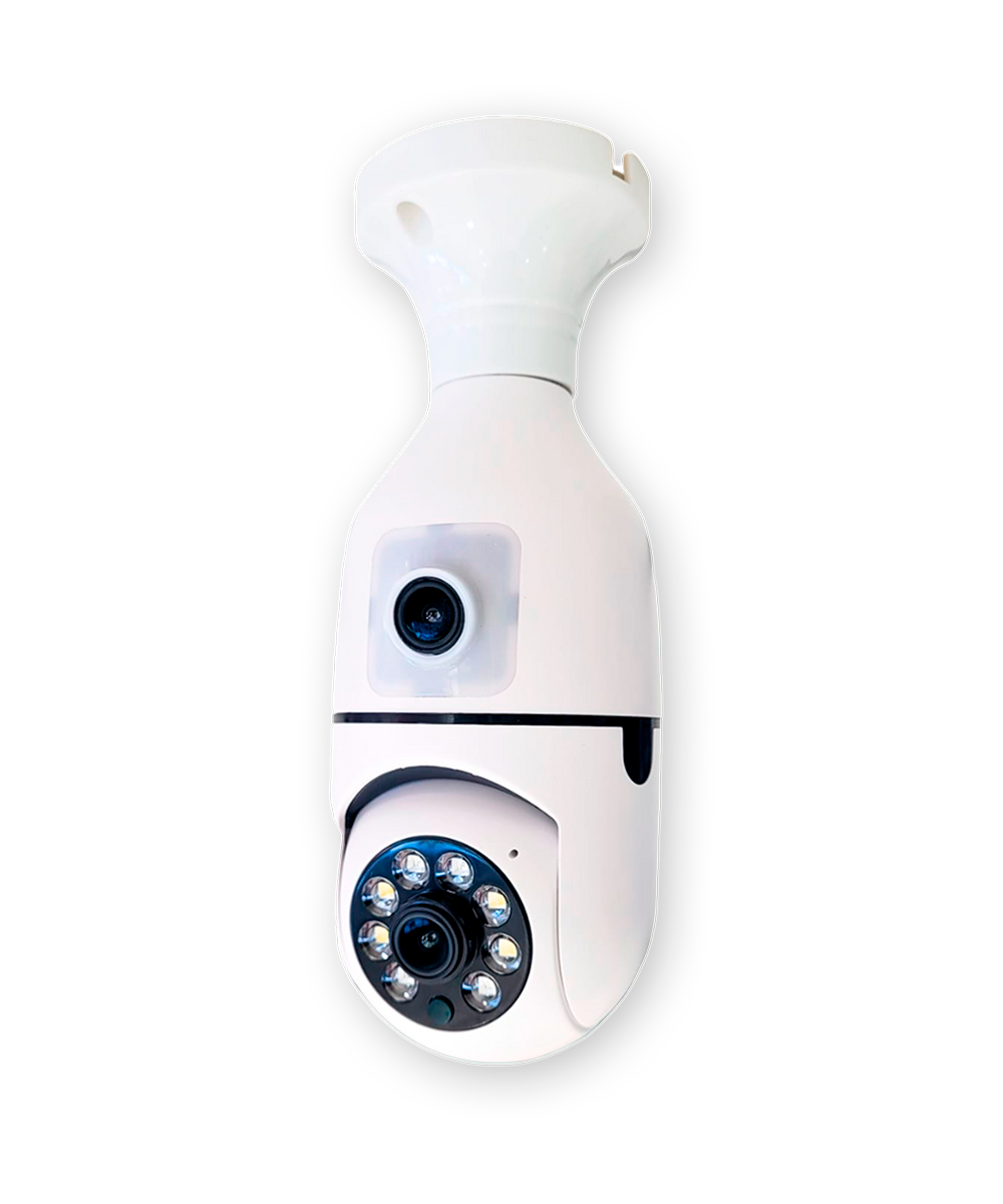 Câmera com duas lentes para cobertura ampliada, reduzindo pontos cegos. Fácil instalação em bocais de lâmpada convencionais, com controle total via aplicativo. Conta com visão HD, infravermelho e acompanhamento automático.