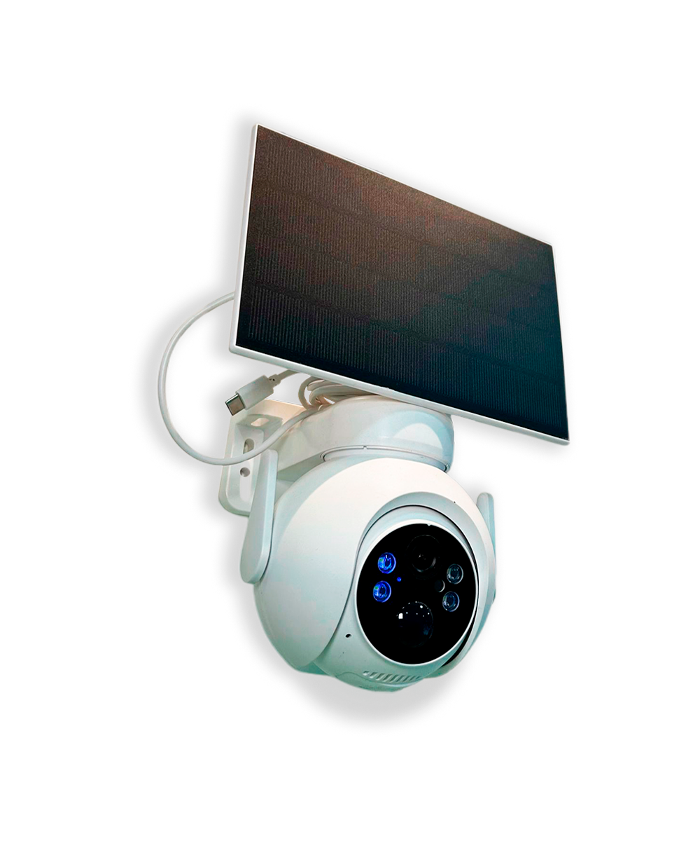 Câmera alimentada por painel solar e bateria interna, totalmente preparada para áreas externas. Possui detecção de movimento, visão noturna, gravação automática e monitoramento remoto. Excelente para chácaras, sítios, fachadas e portões.